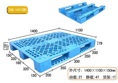 产品型号: HD-1411cw1 产品货号: T45川字型塑料托盘 产品外尺寸: 1400×1100×150mm 产品内尺寸: 产品结构: 单面网格川字底型 产品内容量(L): 承重量(T): 动载2T,静载4T,货架载1T 产品认可标准: ISO9001:2000质量体系认证