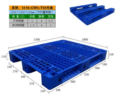 产品型号 HD-1210CW5 产品名称 T55 产品外尺寸(mm) 1200*1000*150 产品结构 单面网格川字型(可内置钢管) 承载量 动载1.5吨,静载4吨,货架1吨 产品认可标准 ISO9001:2000质量体系认证 此款塑料托盘上表面可内置4根钢管,川字底部内置4根钢管,货架上的载重量大,适合平地垫仓,在货架上和