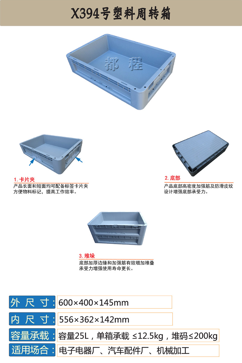 編號: 394 外尺寸(mm): 600*400*145 內(nèi)尺寸(mm): 556*362*142 內(nèi)容積(L): 25 備注: 適用于電子電器廠、汽車配件廠、機(jī)械加工廠等行業(yè)。