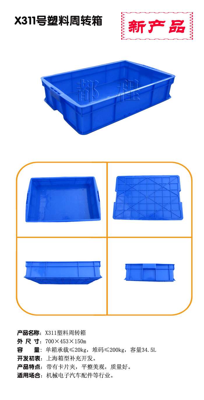 編號(hào): 311 外尺寸(mm): 700*453*150 內(nèi)尺寸(mm): 640*4208140 內(nèi)容積(L): 34.5 備注: 適用于電子電器、汽車(chē)配件等行業(yè)。